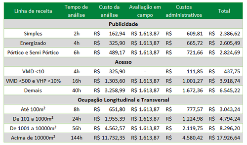 Ressaltamos que os valores serão cobrados a partir de 01/04/2022, correspondendo aos novos processos. Como referência para definição dos valores a serem cobrados, foi utilizada a Resolução nº 9, de 12 de agosto de 2020, emitida pelo DNIT – Departamento Nacional de Infraestrutura de Transportes.